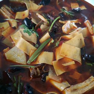 将底料炒出香味儿。锅中加水,烧开下入配料,煮10分钟左右。后下毛肚,2分钟即可。不要煮久了。毛肚会老。