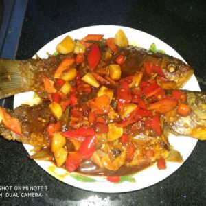 煎至两面金黄之后依次放入大蒜子、生姜、小米椒,在倒入少许料酒去腥,然后加入水莫过鱼身,这时可以加入一点酒槽还有少许陈醋,陈醋的作用是去腥,然后大火烧开之后转中火