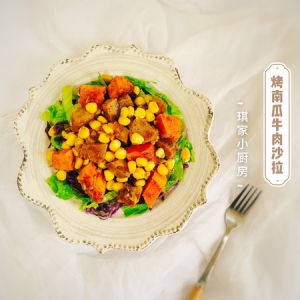 取盘铺上生菜和紫甘蓝,再铺上拌匀的南瓜牛肉粒即成。