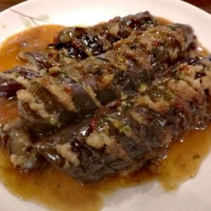 茄子对半切开后,斜刀切开一道道间隔1cm的口,不要切断(可以用筷子垫着切)
