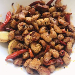 在锅里留少量的油,下豆瓣酱和干辣椒、花椒、蒜瓣一起炒,爆香了加入炸好的鸡肉一起翻炒。