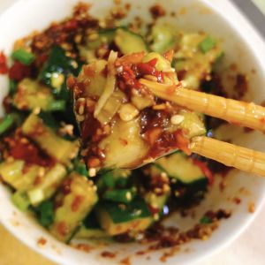 把黄瓜放进去调味吧……盐巴少一点了,因为还有生抽、耗油、白胡椒粉一点点、花椒油、或者花椒粉,再来一点点白糖,当然,喜欢吃醋的再加一点点,搅拌均匀,哇塞!人间美味呀,一根不够我吃呢……上面可以撒一些芝麻、小菜,