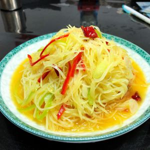 冲洗掉土豆中的淀粉,用手多淘洗几遍,直至水中没有泡沫,这样土豆丝炒起来不会太粘