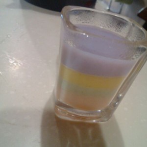 首先挖两大勺双皮奶粉,两小勺果粉。我是先放的木瓜粉。然后等一层做好。放置冷却,我是放在空调下面吹好的。