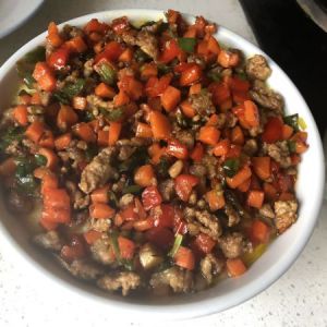 豆腐切小丁,肉切成肉末,辣椒切小丁,也可以放洋葱不太喜欢吃洋葱所有放了胡萝卜切小丁。