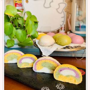 按面皮大小顺序从大到小往上叠四片颜色不一样的面皮。