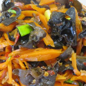 泡了一个钟头的木耳已经膨胀啦,把它切丝,所以食材都准备好了,咱们开始做菜