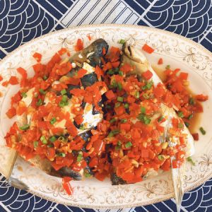 正好后,将姜片葱段取出,鱼头放入盘中(这一步一定要小心,不要把鱼头弄散了,怕弄散了的话,蒸鱼头的时候直接用盘子蒸,省去这一步)。浇点鱼露,啤酒,生抽提味。