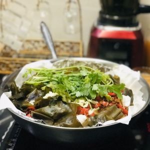 最后放上香菜开吃,海带丝放边上慢煮,像吃火锅一样,最后芋头片比鱼好吃,太棒了。