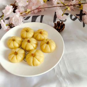 取均匀的面团揉圆,之后用水果刀或者刮板按成南瓜形状,顶部加上葡萄干做蒂。