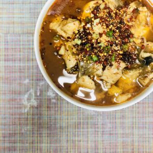 10.鱼片煮熟捞出,撒上蒜泥、小葱段、辣椒碎、花椒,热锅烧油,一定要大火,温度一定要高,锅边冒烟温度刚好,浇热油!