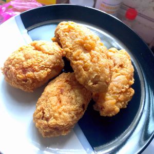 冰箱拿出隔天腌制的鸡翅,裹上一层炸鸡粉(粉里面可以加入少许盐和胡椒粉)再裹一层鸡蛋液还要再裹一层炸鸡粉,锅热小火慢炸,炸制颜色比较深金黄的时候捞出
