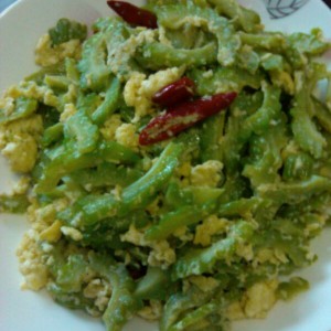 锅中入油油热加入蒜瓣辣椒炒香倒入苦瓜翻炒,依个人口感决定要不要再加盐。翻炒几下后倒入蛋液,待蛋液底部凝固翻面,不断翻炒至鸡蛋熟了即可。感