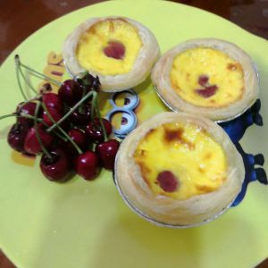 蛋挞液倒入蛋挞皮中,樱桃去核放入