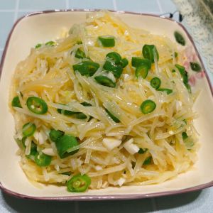 土豆丝翻炒至半透明状(大约1分钟,量大约2分钟),加辣椒和蒜末,加盐,加两勺醋,继续翻炒。