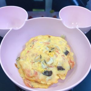 将蔬菜、鸡蛋、面粉搅拌均匀,锅子内不用加油,小火慢煎即可