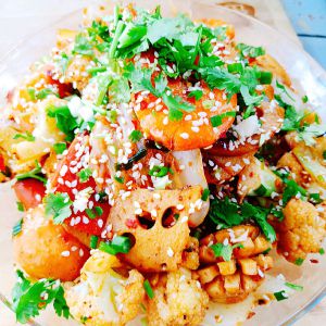 翻炒几下装盘盛出,撒上香菜叶和白芝麻