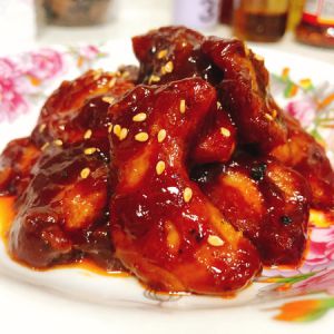 裹上玉米淀粉,热锅热油下里脊炸至金黄捞出,冷却。冷却后大火复炸20秒,捞出备用