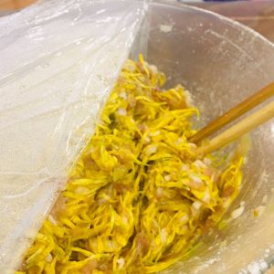 肉加切碎的葱姜末,放入所有调料适量,也可根据自己有的调料添加,搅拌,半碗温水少量多次打入肉馅,直到成黏糊的肉泥,馅就做好了