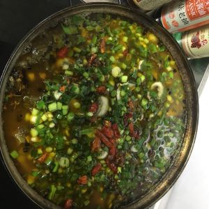 等水开,把事先洗好切碎的酸菜放到锅中同煮,再依次放入小米辣,白醋,以及鸡精。