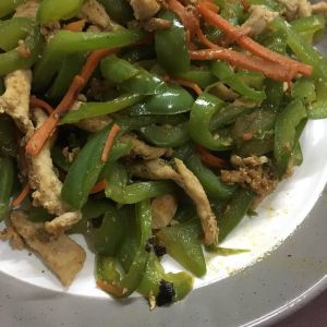 下裹了蛋清的肉丝翻炒至肉丝变白。