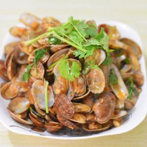 下15ml油,油热了下郫县豆瓣酱,炒香,下葱姜蒜末煸炒,炒香后下花蛤,翻炒几下,下酱汁,继续大火翻炒(根据锅的情况下少量水,继续翻炒),炒2~3分钟后关火,下香菜段,搅匀,装盘~