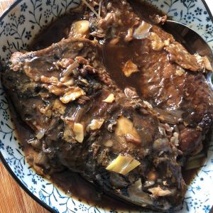 按顺序放料酒,醋,酱油,生抽,葱、姜、蒜,糖,水。如果不喜欢过咸的,可以不放酱油。
