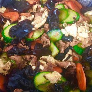 肉盛出后,锅里有油汁,不用再放油,这样比较健康,先放胡萝卜炒,炒到松软再放木耳,然后放黄瓜,放太早,黄瓜的鲜味就没有了,放1汤匙红烧酱油和适量的盐