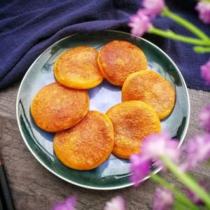 煎至饼底焦黄,翻面,继续小火慢煎。两面都出现焦黄后,要翻面几次继续煎,以保证内部熟透。