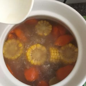 瓦煲加水,放入姜片煮开,就可以加入排骨,莲藕,胡萝卜,玉米,转小火慢炖一小时