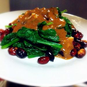 菠菜摆好,撒上花生,淋少许陈醋,均匀撒上芝麻酱