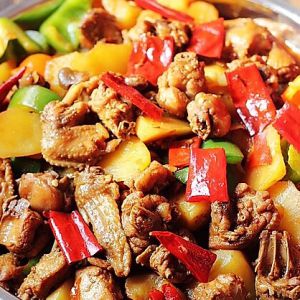 加入冰糖,翻炒至焦黄色后,加入鸡块翻炒,挂色
