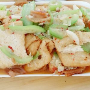 沥油放盘,锅里放辣椒酱,姜蒜炒香,倒入适量的水。烧开后下豆腐,煮10分钟后下丝瓜。