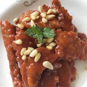 里脊条炸制两遍,呈金黄色后捞出,锅内少量底油,放番茄酱,少量糖,少量白醋,水淀粉勾芡,倒入里脊条,每条都沾满蕃茄酱汁,撒松子仁,出盘