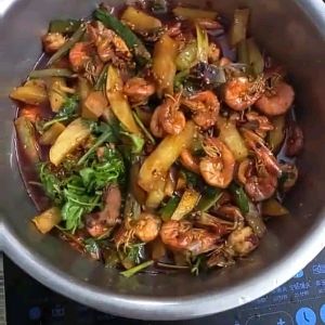 放入虾,土豆闷煮一会放入黄瓜,加盐调味,撒入白芝麻翻炒后倒入盘中撒上香菜碎。