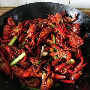 倒入小龙虾翻炒,我炒的时间较长,想让龙虾比较入味,后来证明我做到了。