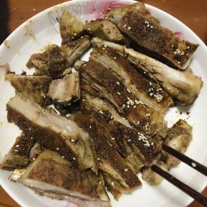 把晾干水的羊排抹一层辣椒粉,一层孜然粉,一层花生油,然后腌制入味半小时