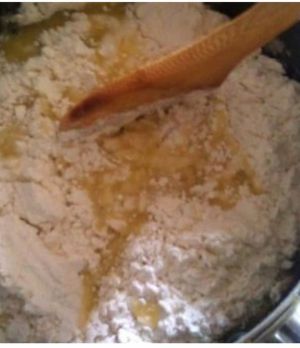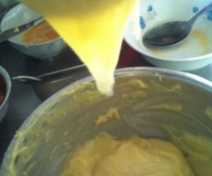 面糊不太烫手的时候加入鸡蛋不要一次性加入分三次,不用全部加看情况,搅拌到,抬起时,有倒三角形