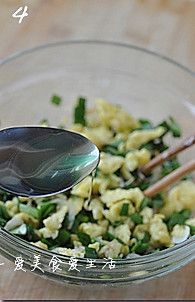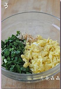一小把韭菜洗净切碎,一勺虾皮洗净沥干,放入炒好的鸡蛋碎,加盐和鸡精拌匀