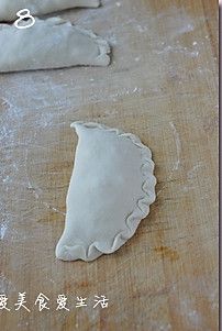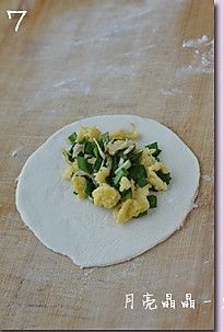 放一勺拌好的韭菜鸡蛋馅在面片的一边