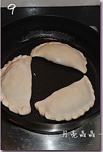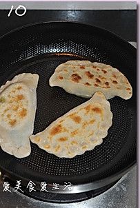 平底锅用纸巾蘸色拉油,在锅中抹一遍,把做好的韭菜盒子平铺入锅。