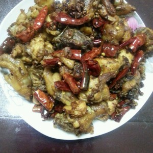 锅里放入底油改小火烧热,放入麻椒炒出味儿放入辣椒,翻炒几次放入炸好的鸡块不断翻炒,放入盐放入酱油上色即可出锅