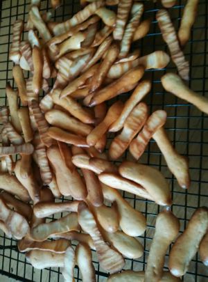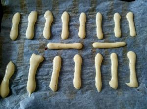 裱花袋装进面糊,底部煎小口挤在烤盘上长条形