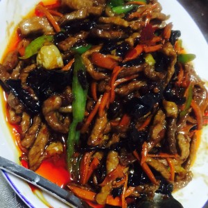 锅里留油,倒入木耳翻炒片刻,然后倒入胡萝卜丝,炒至变软,捞出待用