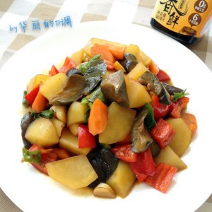 快熟的时候放青红椒,倒入适量味事达酱香鲜,拌匀,盖上盖子闷一下,入味。