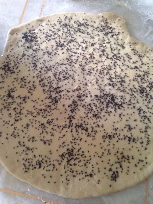 面团擀成面皮 在面皮上铺上一层猪油 撒上芝麻 撒均匀