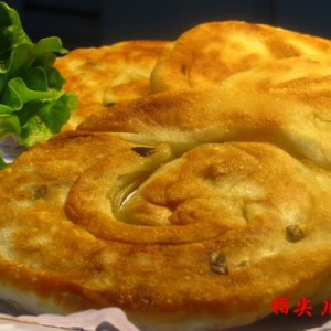 在粘了油的案板上将剂子擀成细长条,将准备好的小葱油均匀的涂抹在细长条的面片上;