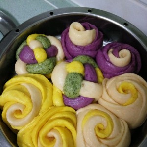 紫薯、南瓜去皮蒸熟碾压成泥,菠菜、西红柿榨汁,分开加入适量酵母、糖和一点奶粉和成面团,放入盆中盖上保鲜膜置室温下发酵。