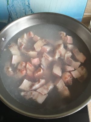热锅放一些白糖炒出糖色后,放入五花肉,倒酱油,翻炒,变色后填热水,末过肉。