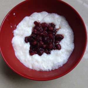 打开蒸好的奶,将之前炖好的红豆放入。(葡萄干,各种果酱均可)